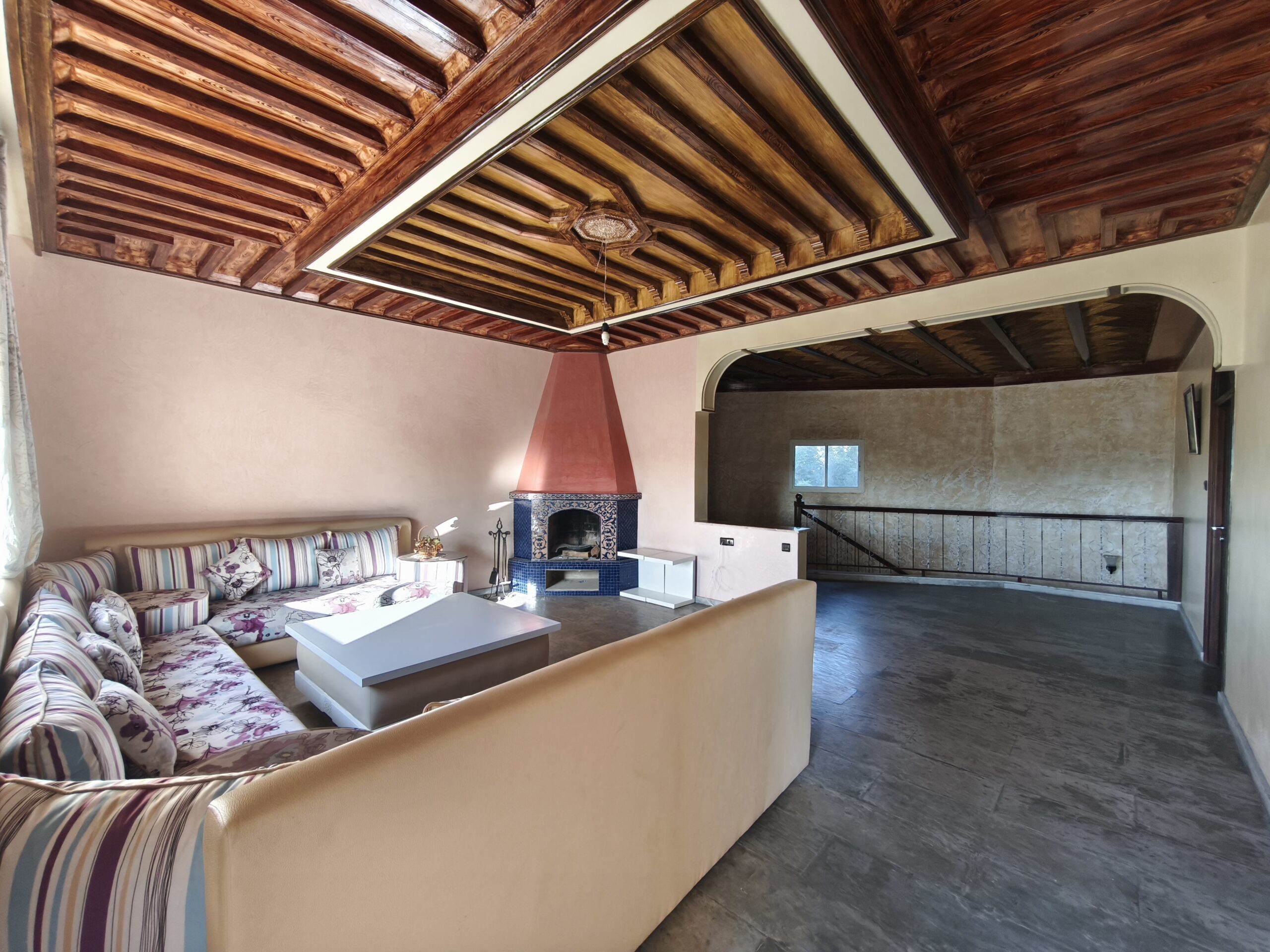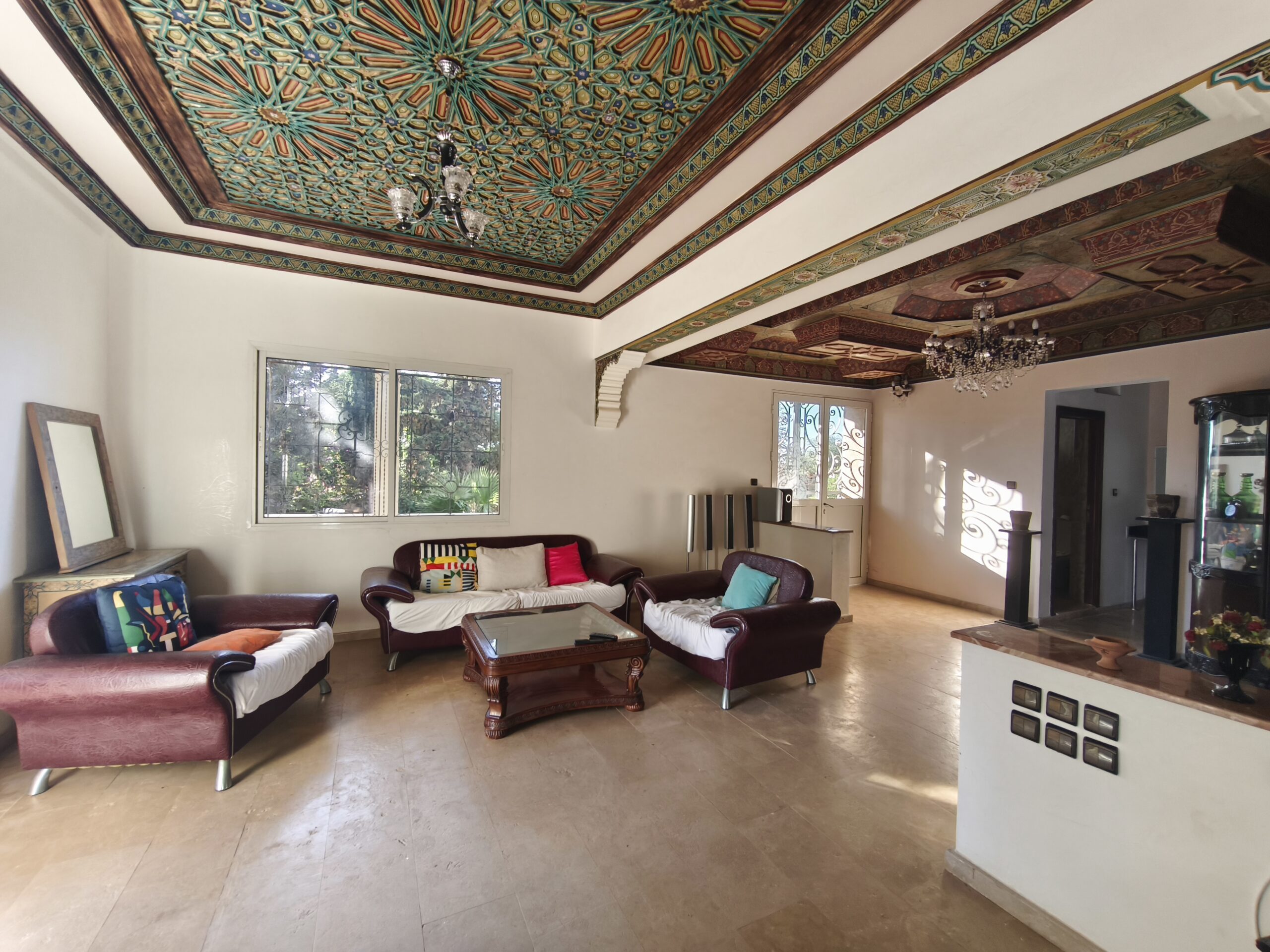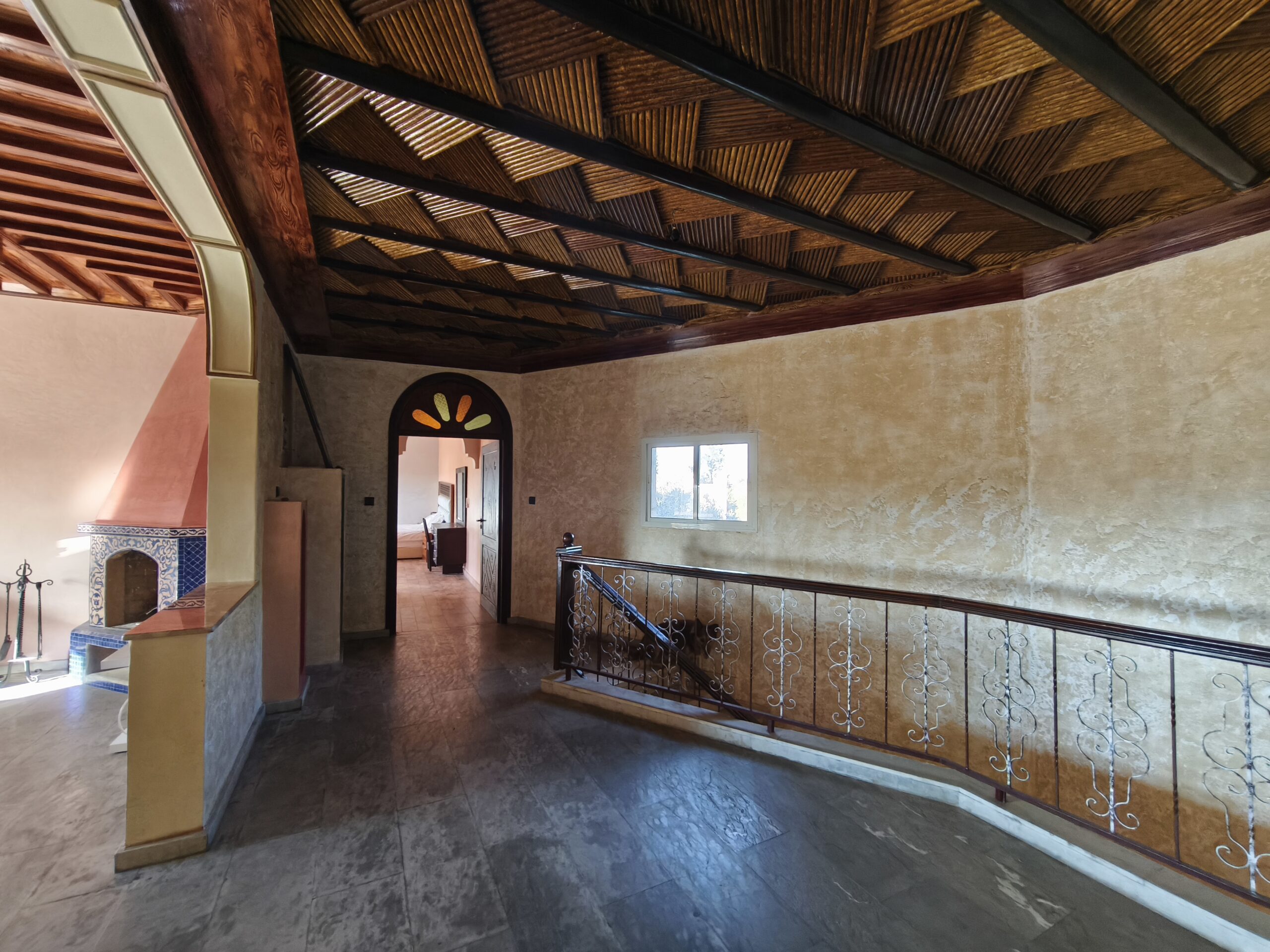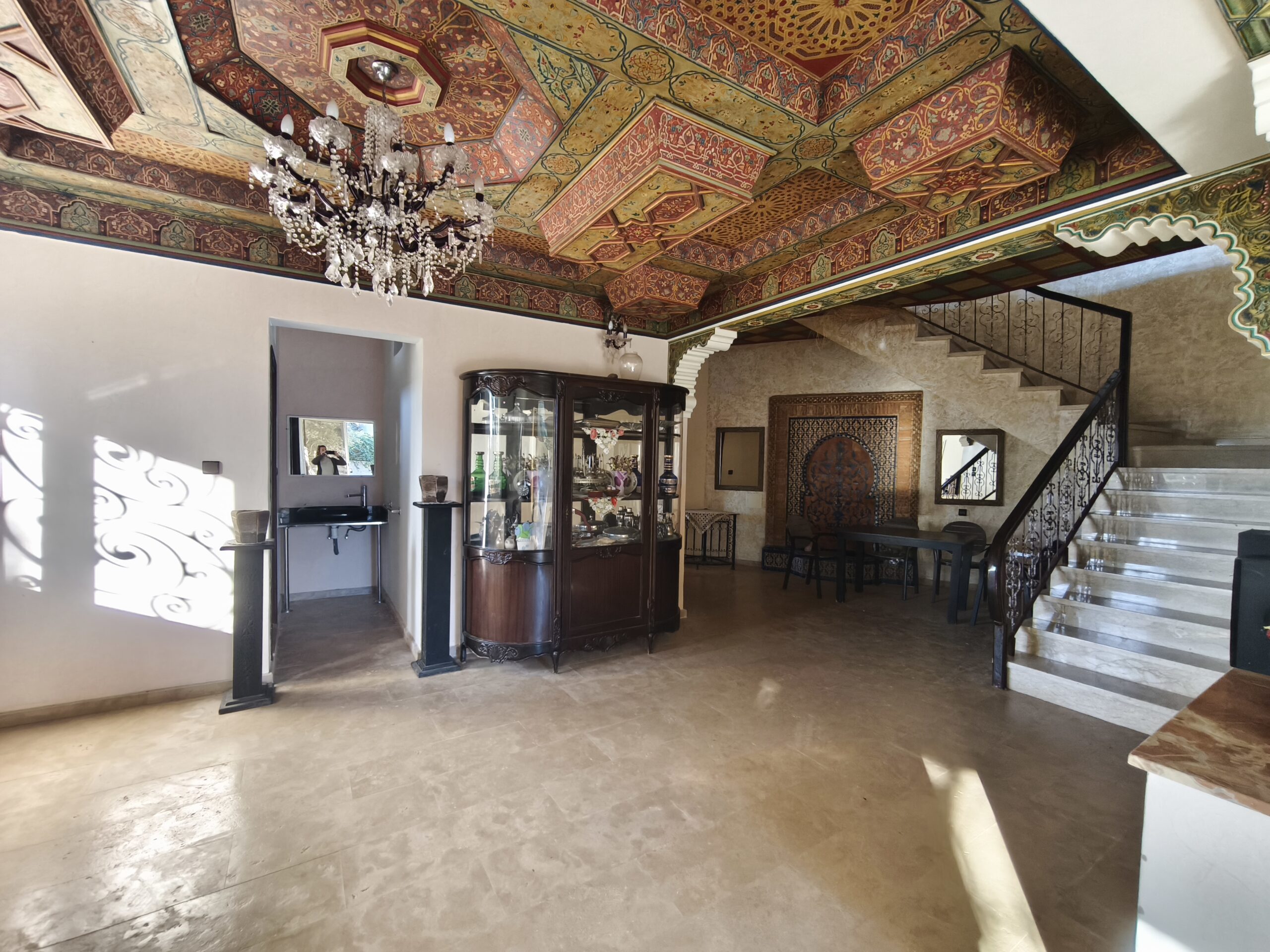Cette propriété possède un beau potentiel, composée au rez de chaussée d’un hall d’entrée, de plusieurs salons, d’une vaste cuisine avec un bar, une arrière cuisine, une buanderie, deux wc invités, une très jolie fontaine en zellige.