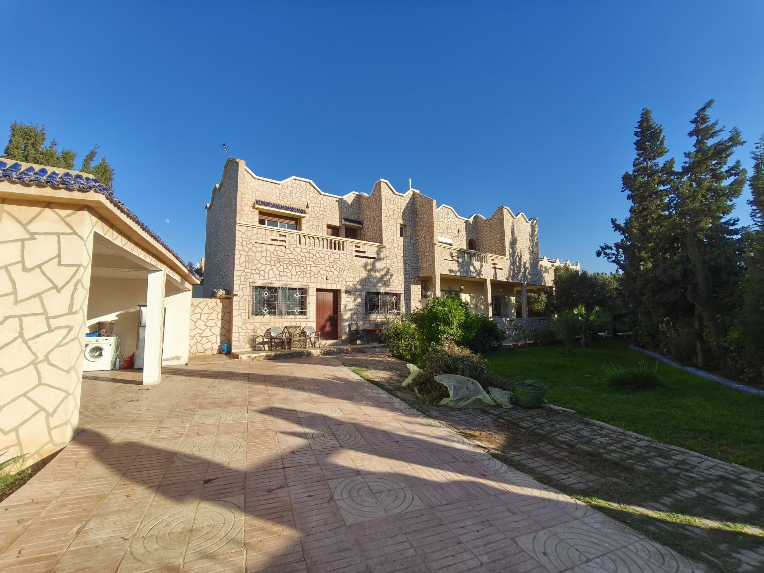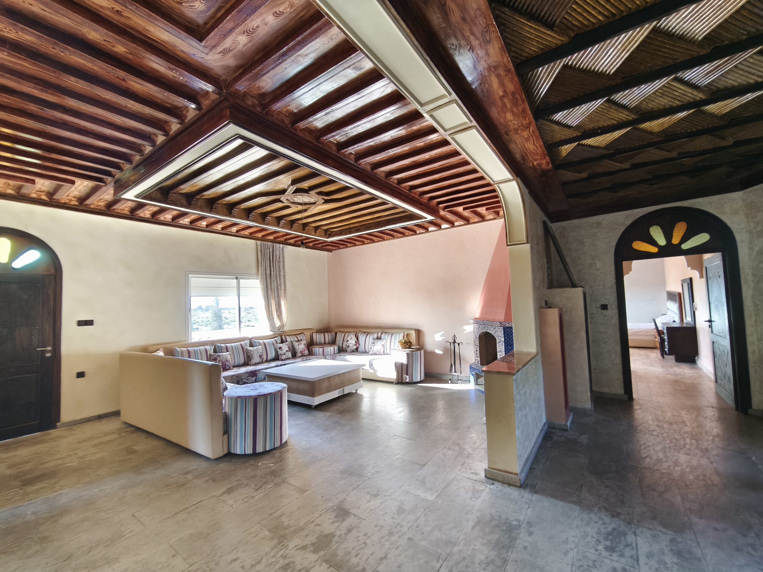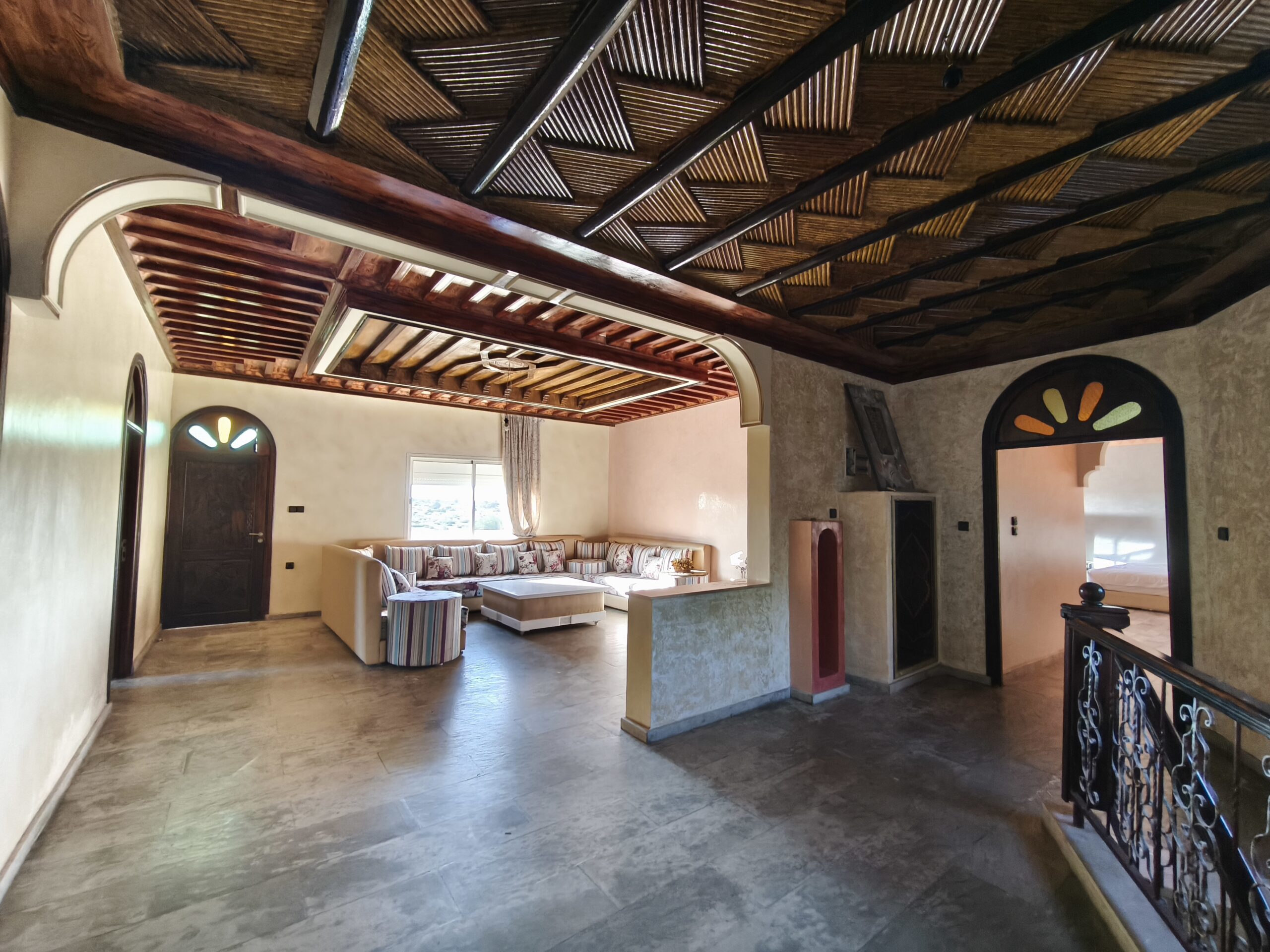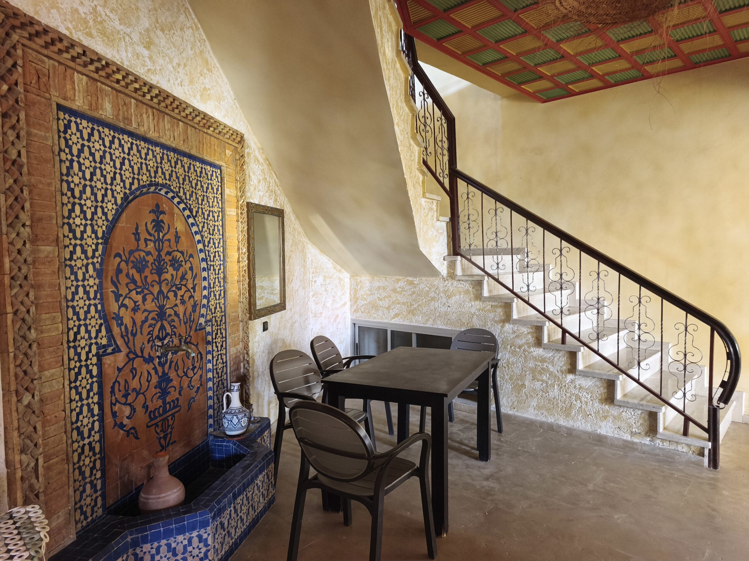 Cette propriété possède un beau potentiel, composée au rez de chaussée d’un hall d’entrée, de plusieurs salons, d’une vaste cuisine avec un bar, une arrière cuisine, une buanderie, deux wc invités, une très jolie fontaine en zellige.