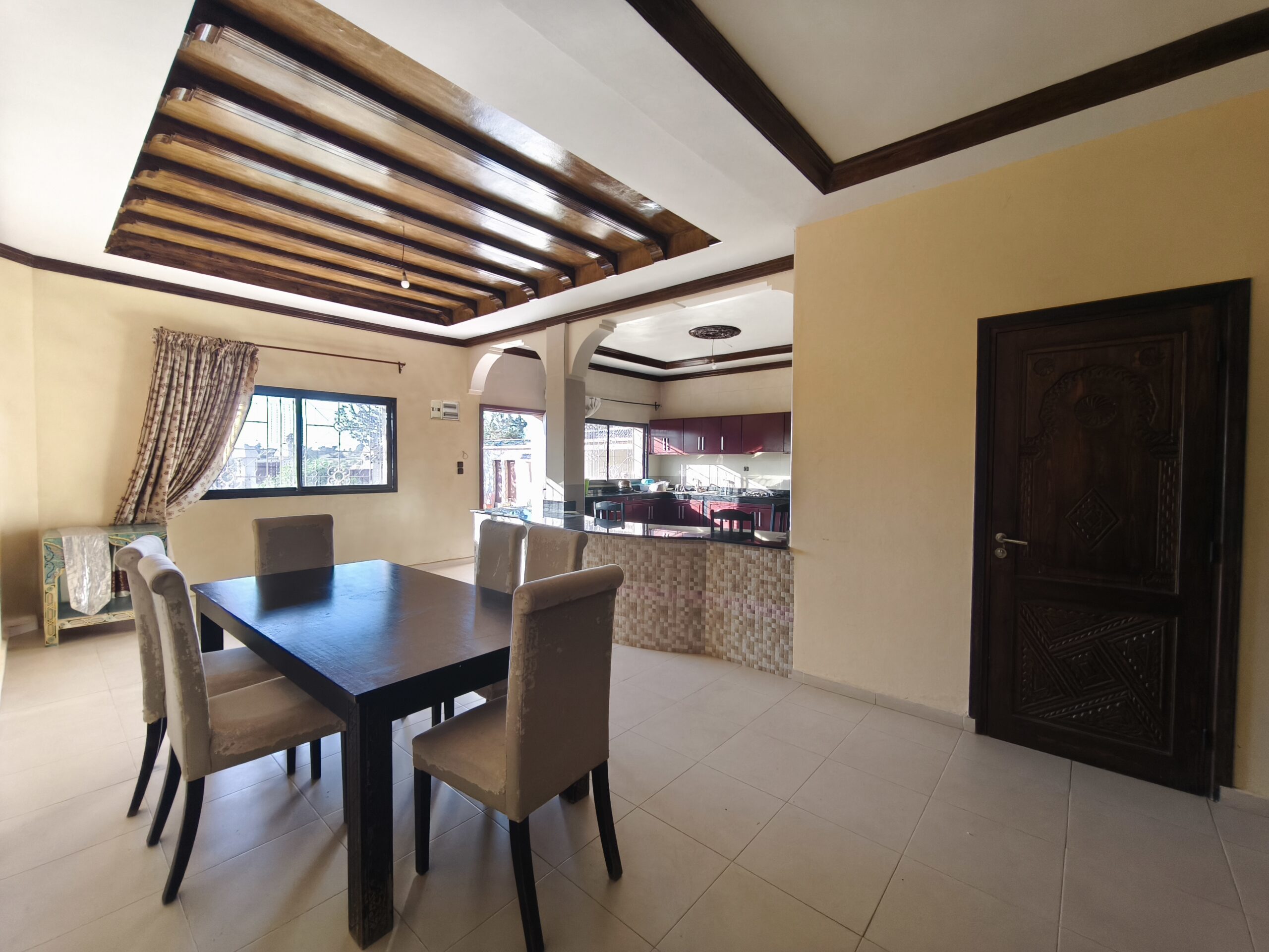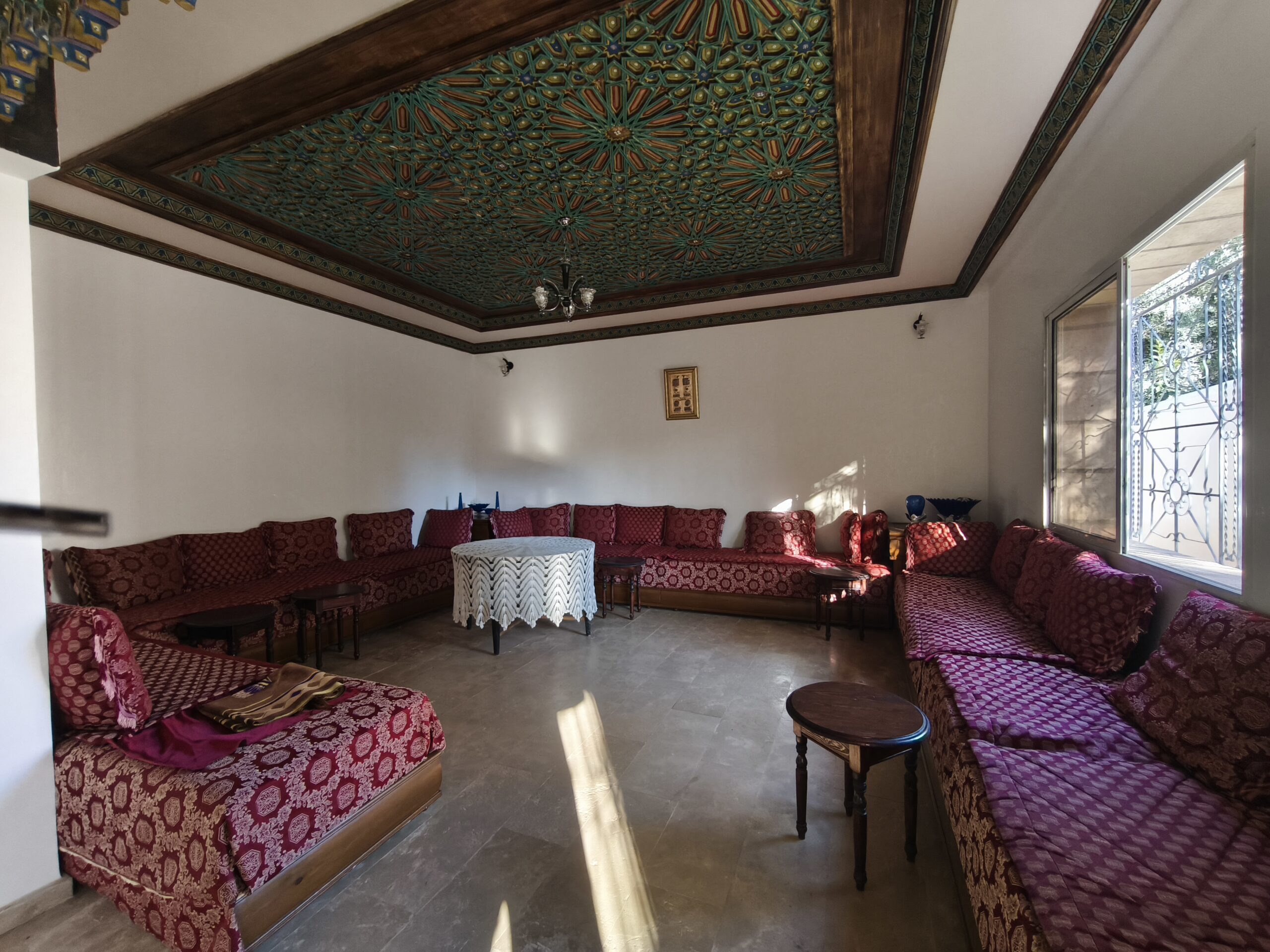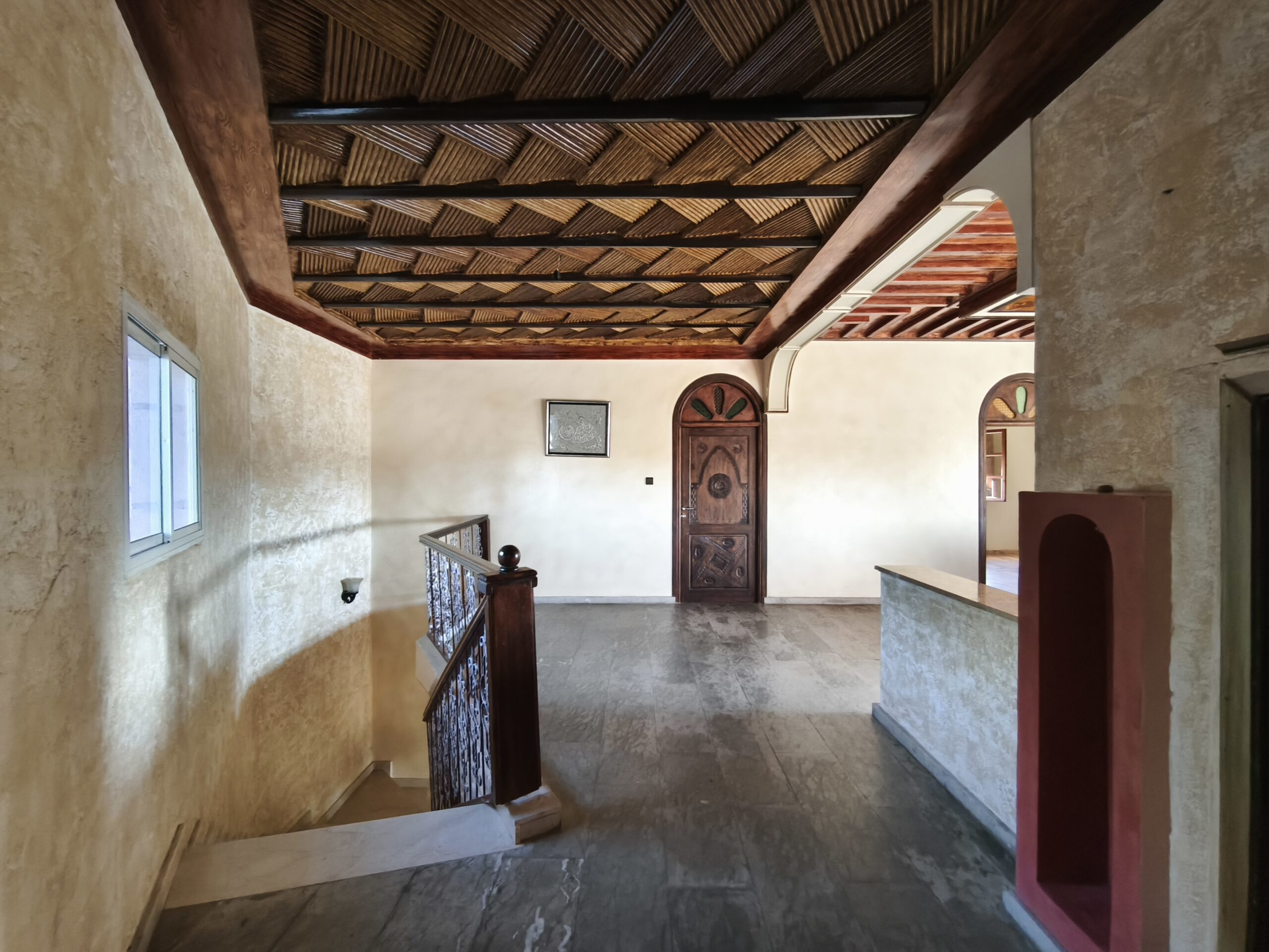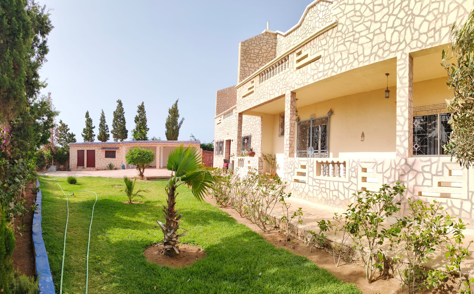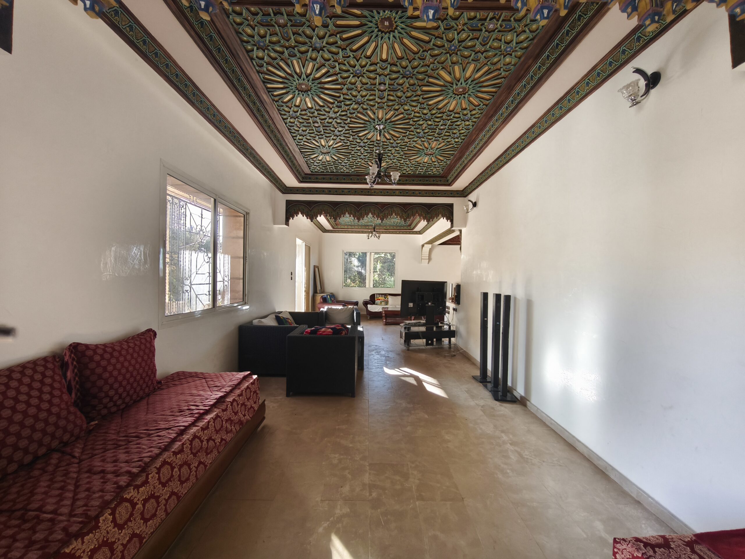 Cette propriété possède un beau potentiel, composée au rez de chaussée d’un hall d’entrée, de plusieurs salons, d’une vaste cuisine avec un bar, une arrière cuisine, une buanderie, deux wc invités, une très jolie fontaine en zellige.