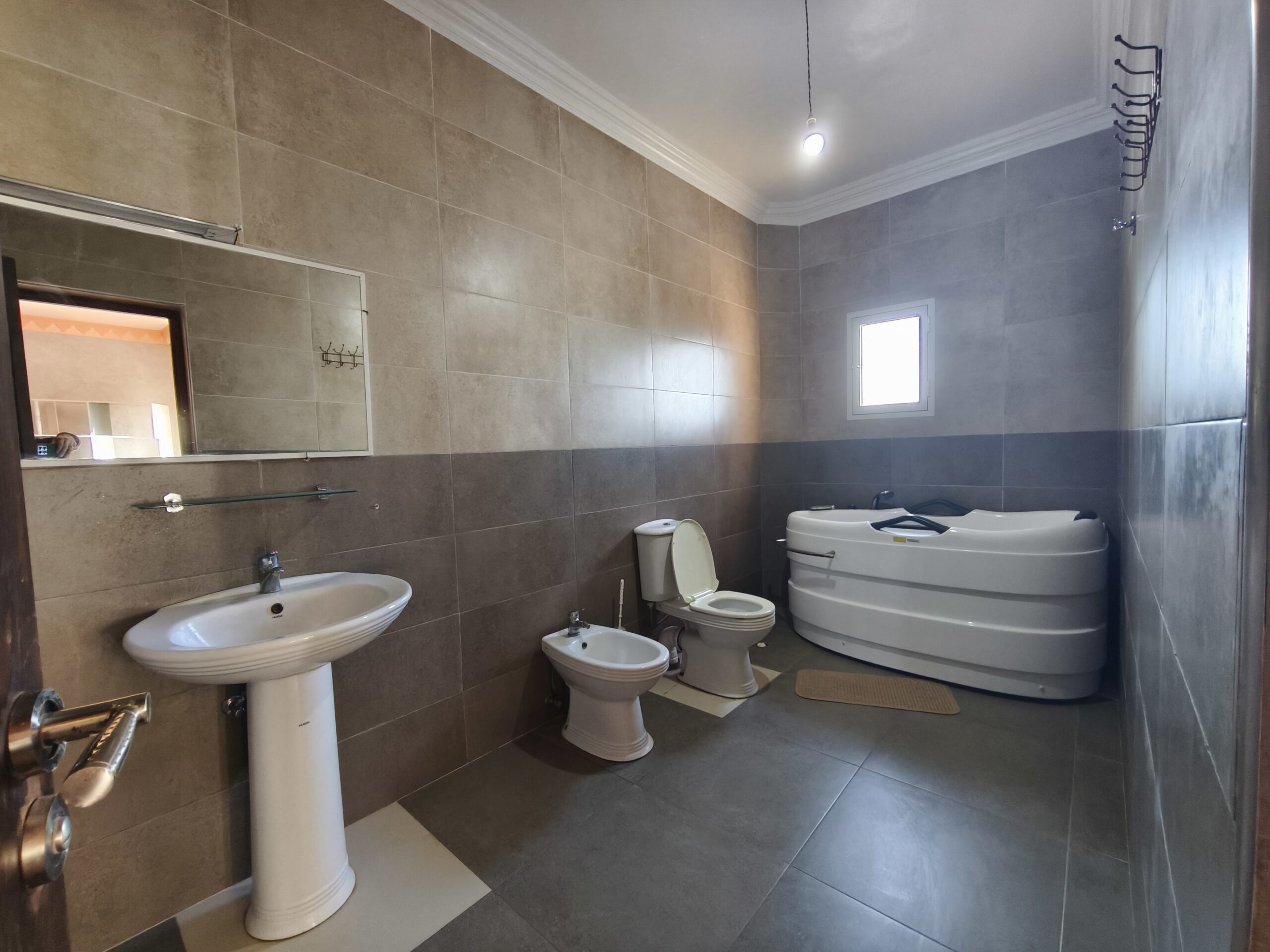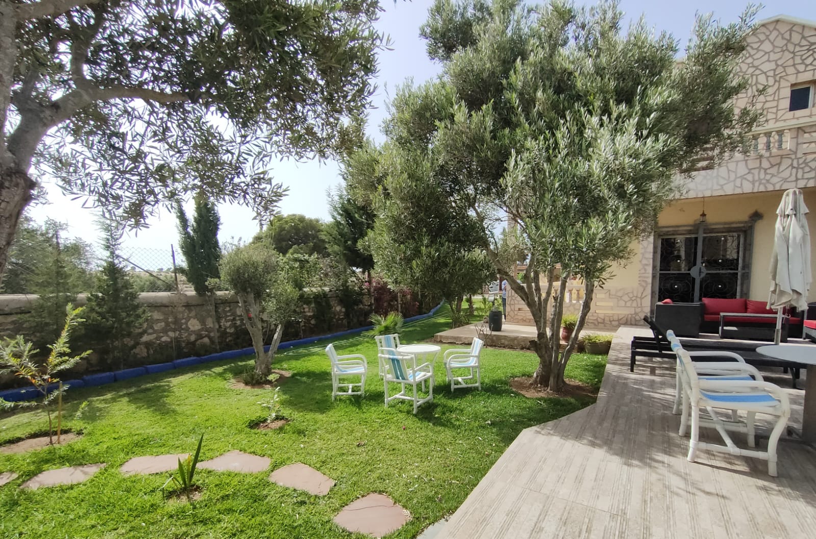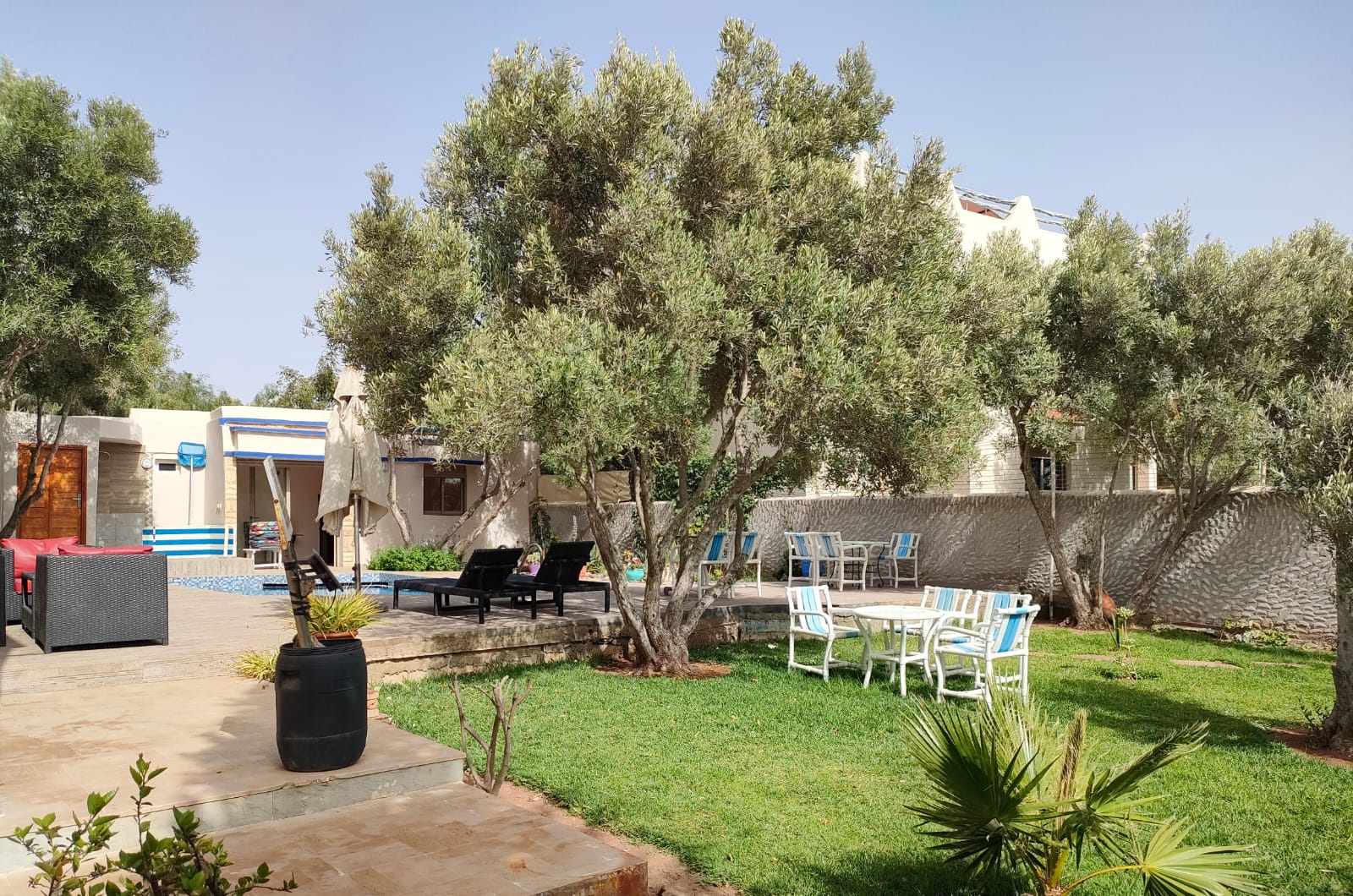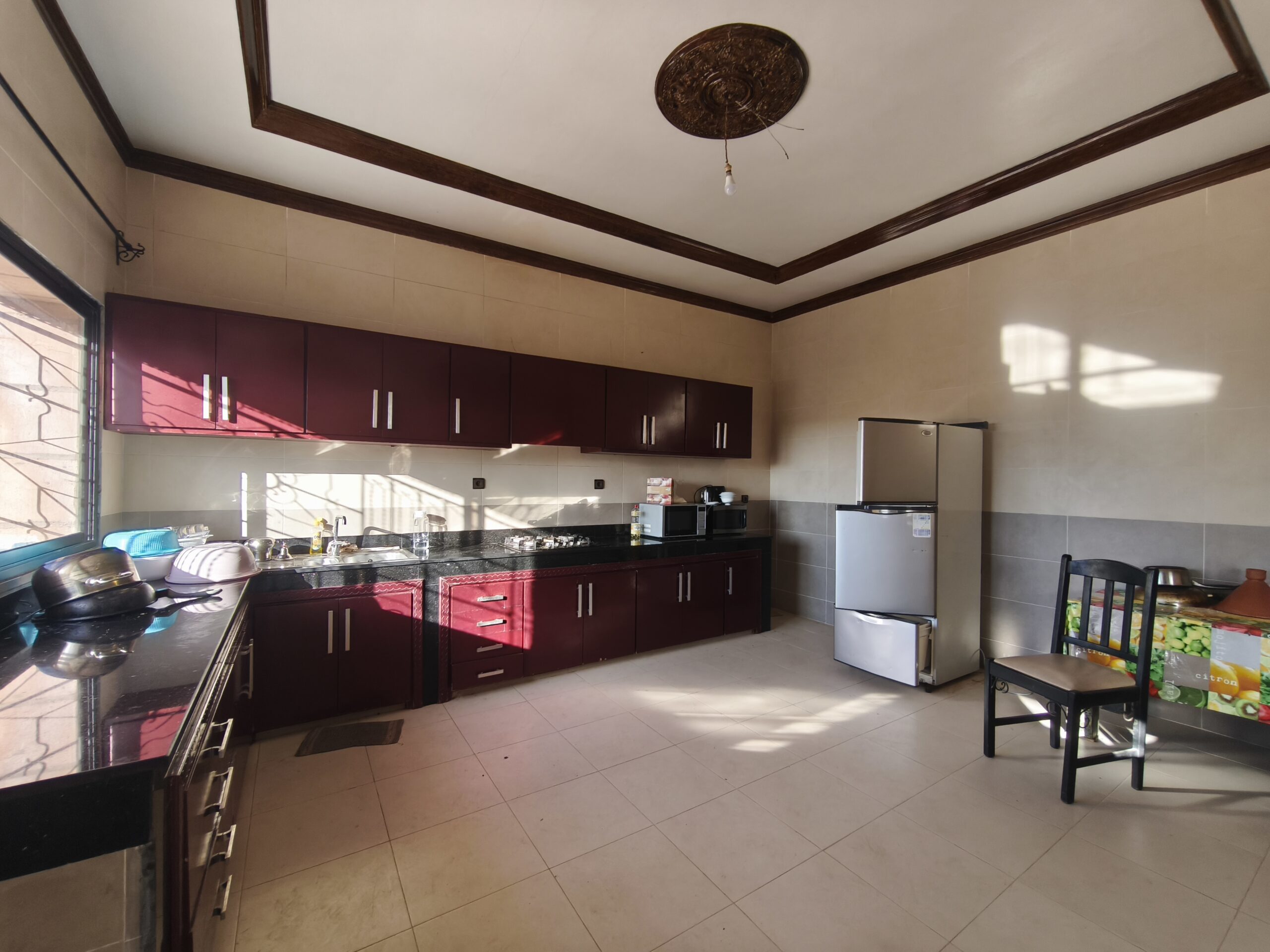 Cette propriété possède un beau potentiel, composée au rez de chaussée d’un hall d’entrée, de plusieurs salons, d’une vaste cuisine avec un bar, une arrière cuisine, une buanderie, deux wc invités, une très jolie fontaine en zellige.