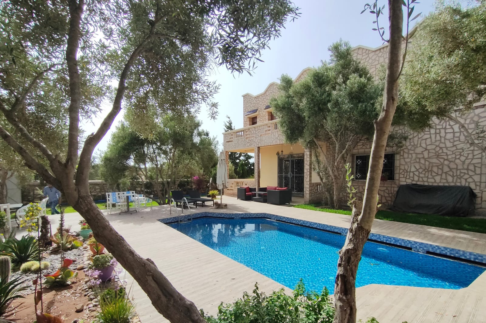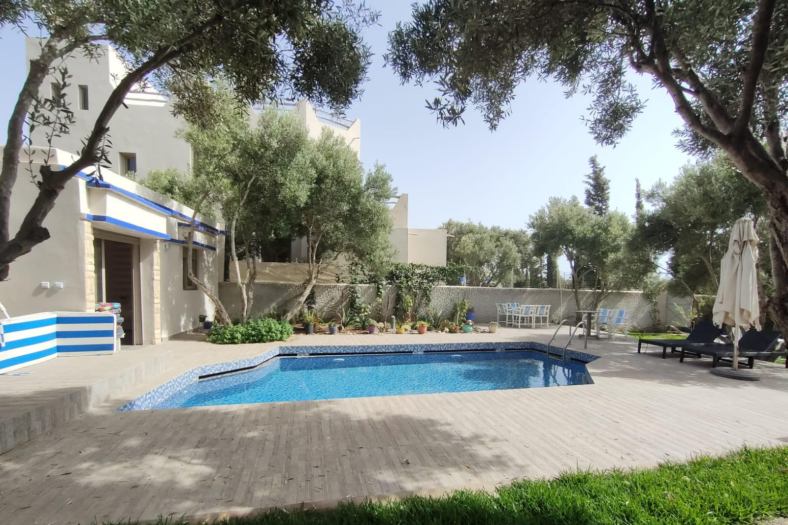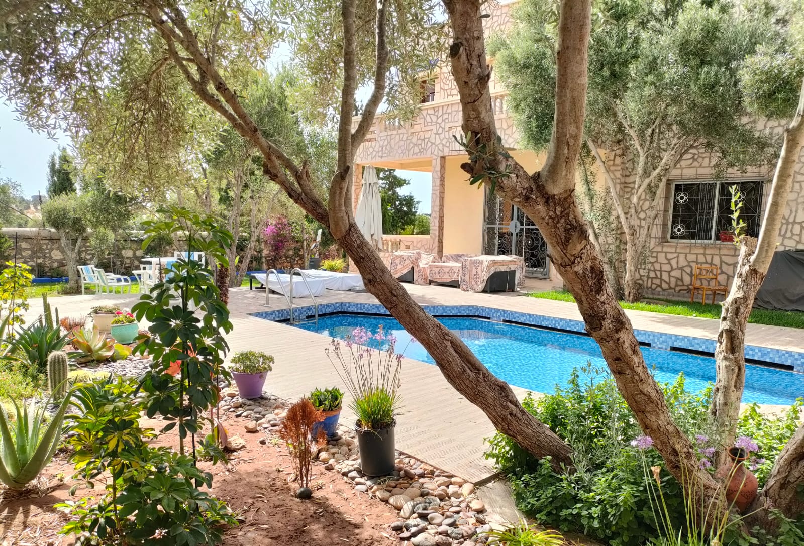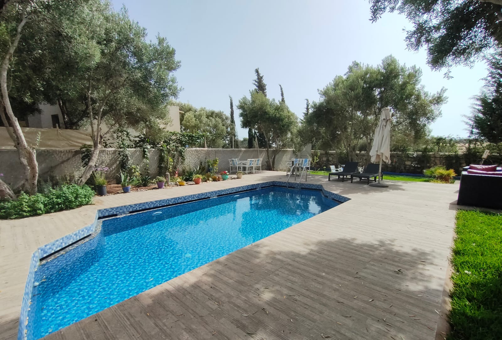 Dans ce beau jardin de 1249m², arboré de plusieurs oliviers, d’hibiscus, nous avons une piscine avec douche et wc attenants…