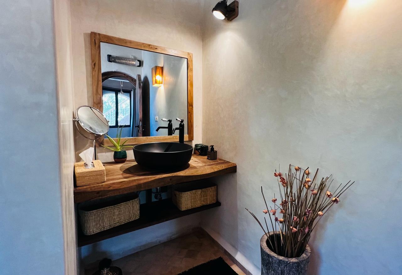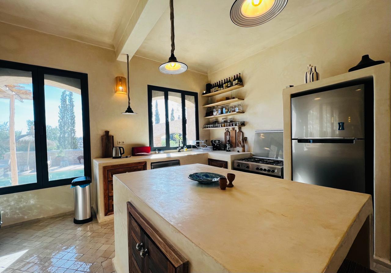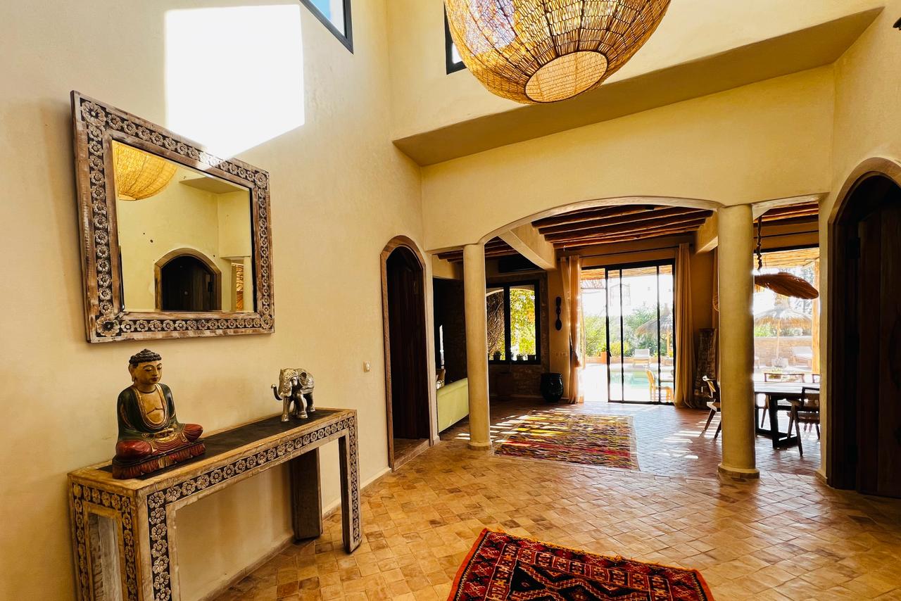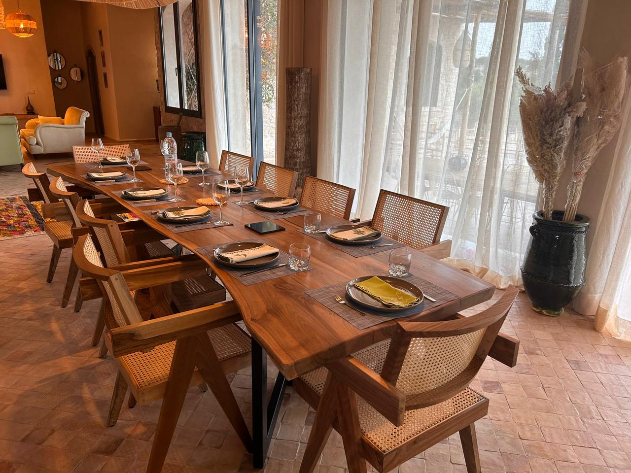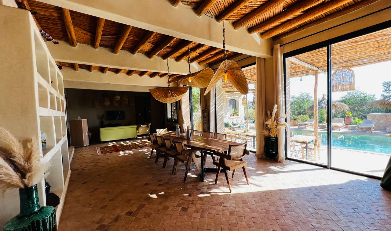 Le charme de cette demeure réside particulièrement dans la qualité des matériaux choisis. Toutes les portes des chambres, les placards, les plans de travails, la table du salon sont en bois de noyer. Plafonds en bois de tuya partout, tadelakt aux murs, carreaux de zelliges émaillés, sols en bejmat naturel, de grandes baies vitrées en aluminium double vitrage partout importées d’Italie. Climatisation réversible dernière génération dans toute les pièces également.